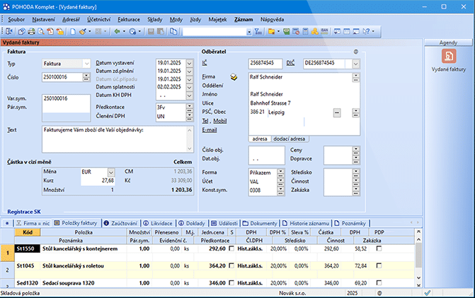 Pohoda je všestranný účetní software od společnosti Stormware, vhodný pro daňovou evidenci i podvojné účetnictví u plátců i neplátců DPH. Umožňuje přehlednou správu adresáře obchodních partnerů, vystavování faktur a objednávek, vedení skladů a mnoho dalších funkcí. Pro výměnu dat s e-shopem využívá import a export v XML formátu.