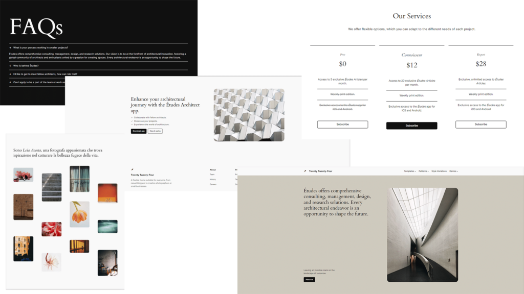 WordPress 6.4 přináší zcela nové výchozí téma s názvem Twenty Twenty-Four. Bylo vytvořeno za účelem oslovení co největšího počtu lidí a je tak vhodné pro většinu webů především díky své rozmanitosti. Téma nabízí více než 35 různých šablon a vzorů. Sami se o nových funkcích a designových záležitostech můžete přesvědčit zde. Twenty Twenty-Four dále zahrnuje až tři rozlišné plně postavené weby v demo verzi pro bloggery, fotografy, a podnikatele.