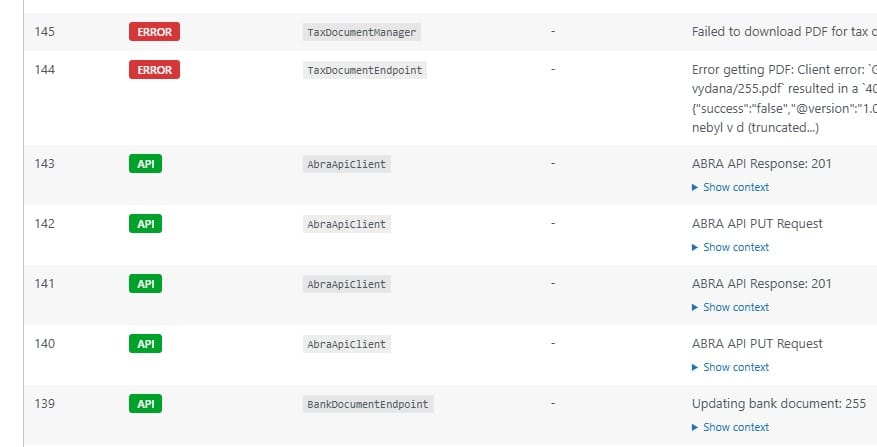 Sledování komunikace s API FlexiBee, nástroje pro kontrolu problémů, pokročilý log, včetně detailních informací o odesílaných a přijímaných datech,filtrování, system status. Aurtomatické odesílání e-mailů s pdf doklady.